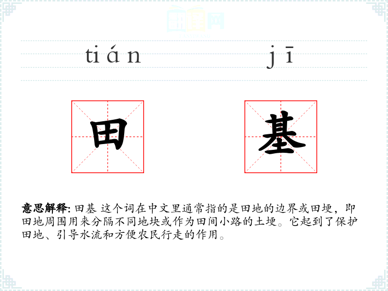 田基 这个词在中文里通常指的是田地的边界或田埂,即田地周围用来分隔不同地块或作为田间小路的土埂。它起到了保护田地、引导水流和方便农民行走的作用。