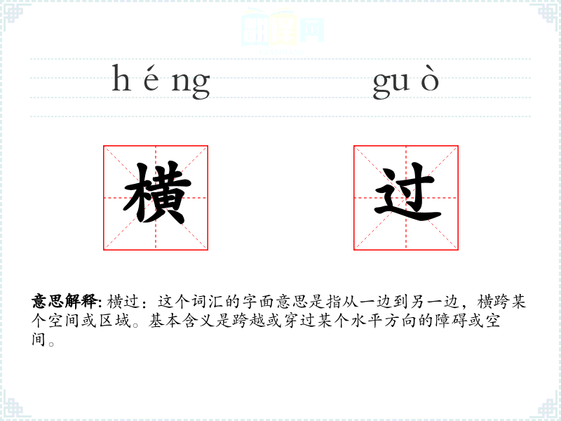 横过:这个词汇的字面意思是指从一边到另一边,横跨某个空间或区域。基本含义是跨越或穿过某个水平方向的障碍或空间。
