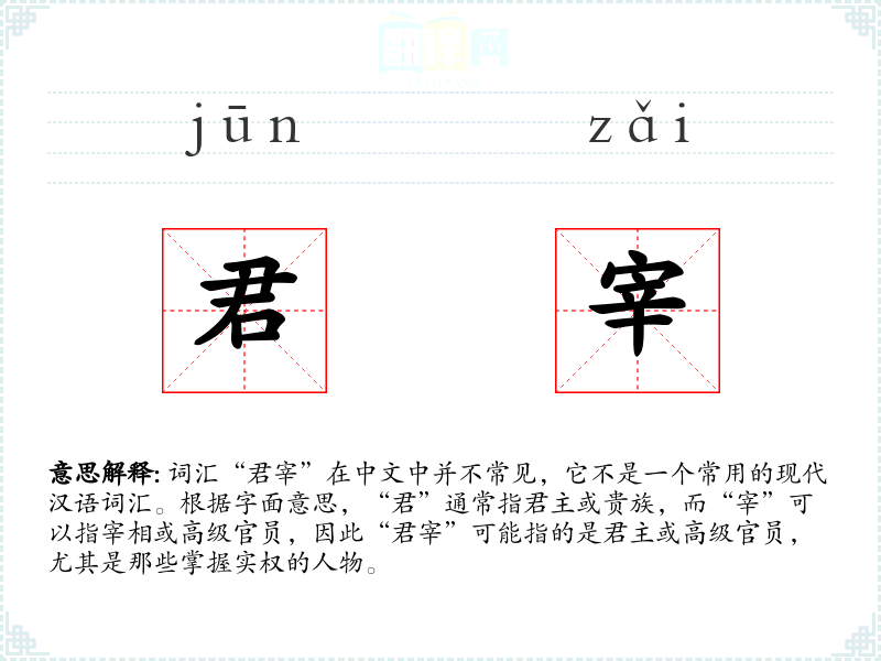 - 词源:可能源自古代汉语,结合了“君”和“宰”两个字的含义。
