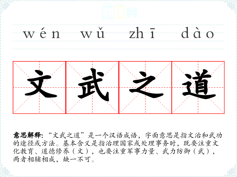 “文武之道”是一个汉语成语,字面意思是指文治和武功的途径或方法。基本含义是指治理国家或处理事务时,既要注重文化教育、道德修养(文),也要注重军事力量、武力防御(武),两者相辅相成,缺一不可。