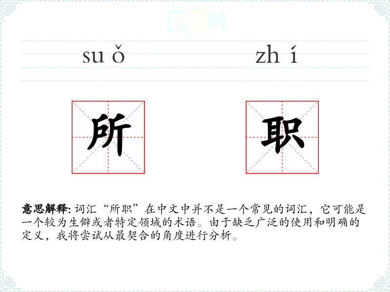 词汇“所职”在中文中并不是一个常见的词汇,它可能是一个较为生僻或者特定领域的术语。由于缺乏广泛的使用和明确的定义,我将尝试从最契合的角度进行分析。
