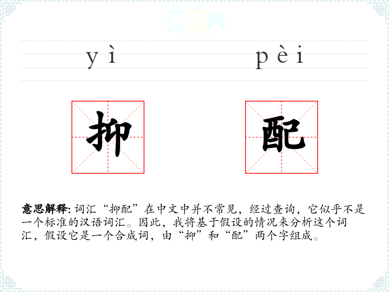 词汇“抑配”在中文中并不常见,经过查询,它似乎不是一个标准的汉语词汇。因此,我将基于假设的情况来分析这个词汇,假设它是一个合成词,由“抑”和“配”两个字组成。