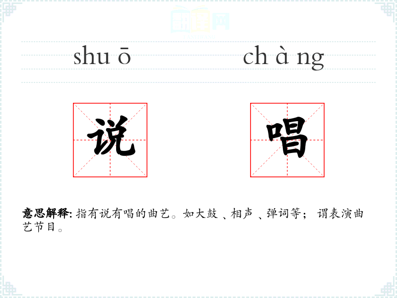 指有说有唱的曲艺。如大鼓﹑相声﹑弹词等; 谓表演曲艺节目。