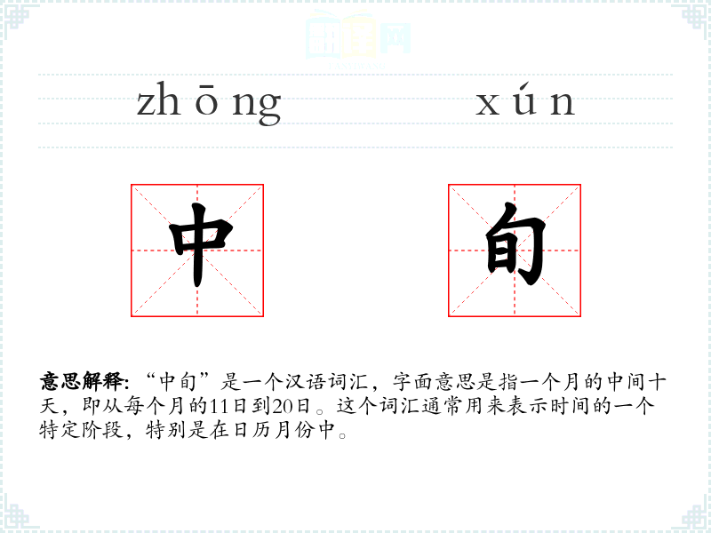 “中旬”是一个汉语词汇,字面意思是指一个月的中间十天,即从每个月的11日到20日。这个词汇通常用来表示时间的一个特定阶段,特别是在日历月份中。