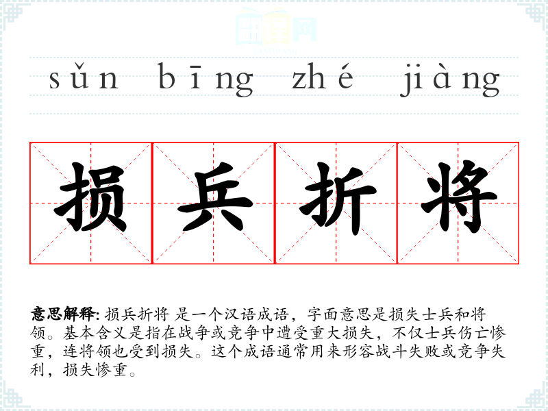 损兵折将 是一个汉语成语,字面意思是损失士兵和将领。基本含义是指在战争或竞争中遭受重大损失,不仅士兵伤亡惨重,连将领也受到损失。这个成语通常用来形容战斗失败或竞争失利,损失惨重。
