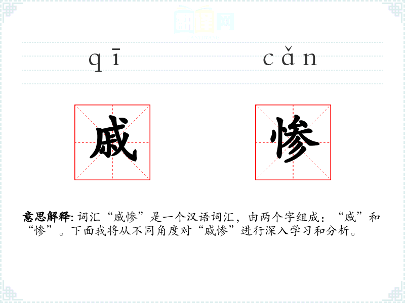 “戚”字最早见于甲骨文,原意为斧头,后引申为悲伤;“惨”字古汉语中意为狠毒、残暴,后逐渐演变为形容悲惨、凄凉。