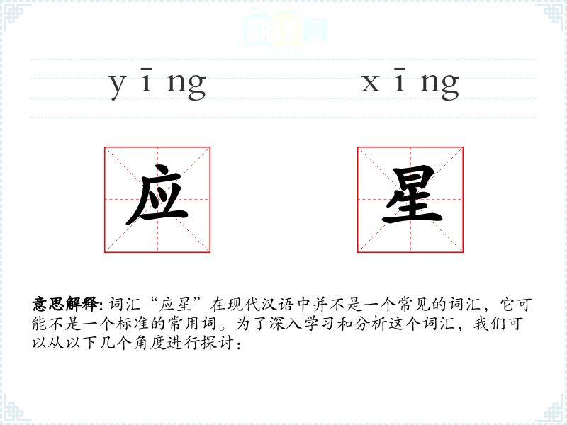 词汇“应星”在现代汉语中并不是一个常见的词汇,它可能不是一个标准的常用词。为了深入学*和分析这个词汇,我们可以从以下几个角度进行探讨:
