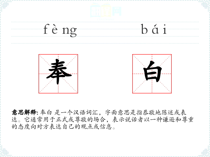 奉白 是一个汉语词汇,字面意思是指恭敬地陈述或表达。它通常用于正式或尊敬的场合,表示说话者以一种谦逊和尊重的态度向对方表达自己的观点或信息。