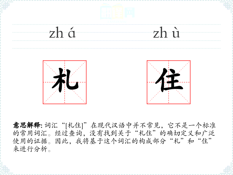 词汇“[札住]”在现代汉语中并不常见,它不是一个标准的常用词汇。经过查询,没有找到关于“札住”的确切定义和广泛使用的证据。因此,我将基于这个词汇的构成部分“札”和“住”来进行分析。