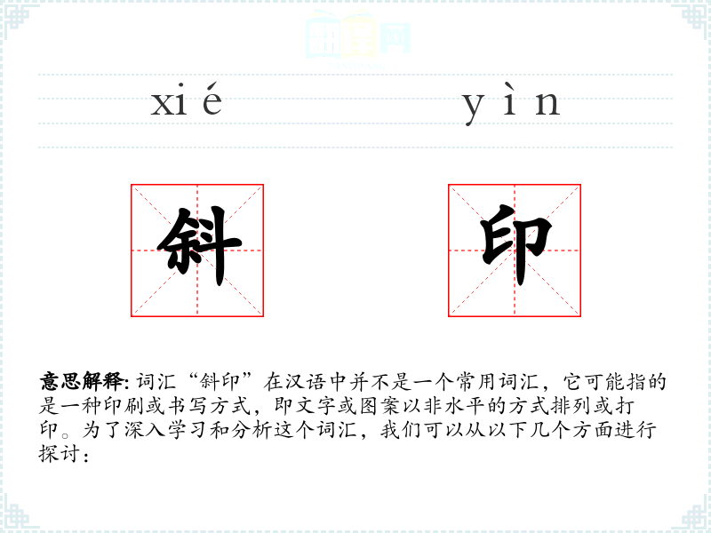 “斜印”这个词汇可能是由“斜”和“印”两个字组合而成,其中“斜”表示倾斜,“印”表示印刷或书写。在语言中的变化不大,主要用于描述特定的印刷或书写方式。