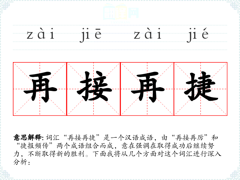 词汇“再接再捷”是一个汉语成语,由“再接再厉”和“捷报频传”两个成语组合而成,意在强调在取得成功后继续努力,不断取得新的胜利。下面我将从几个方面对这个词汇进行深入分析: