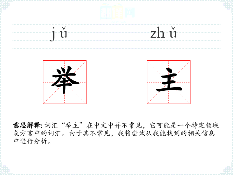 词汇“举主”在中文中并不常见,它可能是一个特定领域或方言中的词汇。由于其不常见,我将尝试从我能找到的相关信息中进行分析。