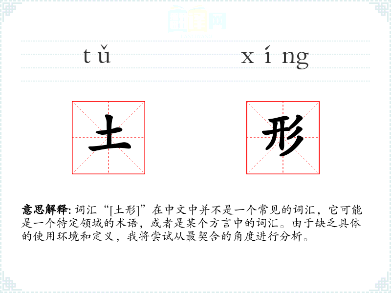 词汇“[土形]”在中文中并不是一个常见的词汇,它可能是一个特定领域的术语,或者是某个方言中的词汇。由于缺乏具体的使用环境和定义,我将尝试从最契合的角度进行分析。