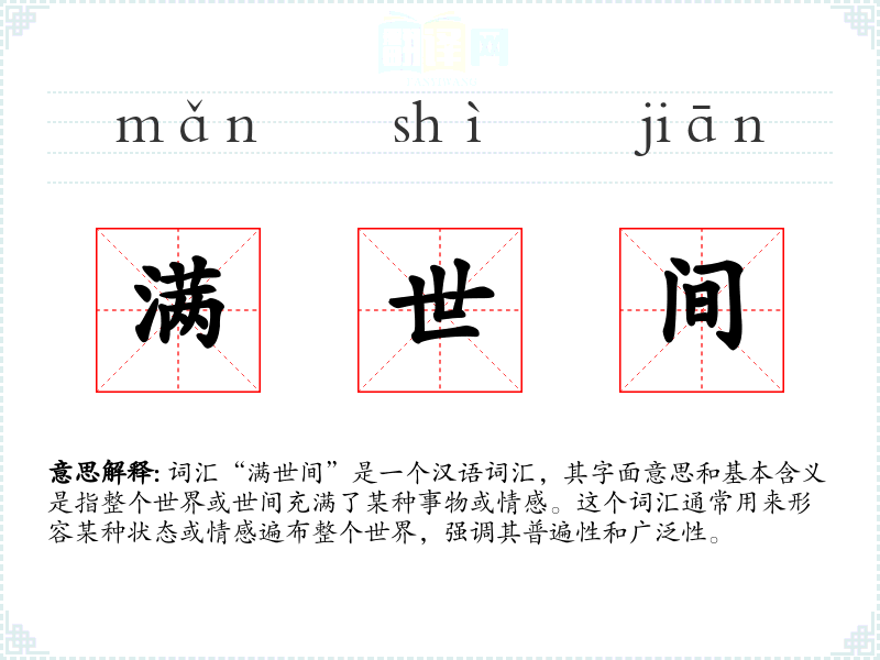 词汇“满世间”是一个汉语词汇,其字面意思和基本含义是指整个世界或世间充满了某种事物或情感。这个词汇通常用来形容某种状态或情感遍布整个世界,强调其普遍性和广泛性。