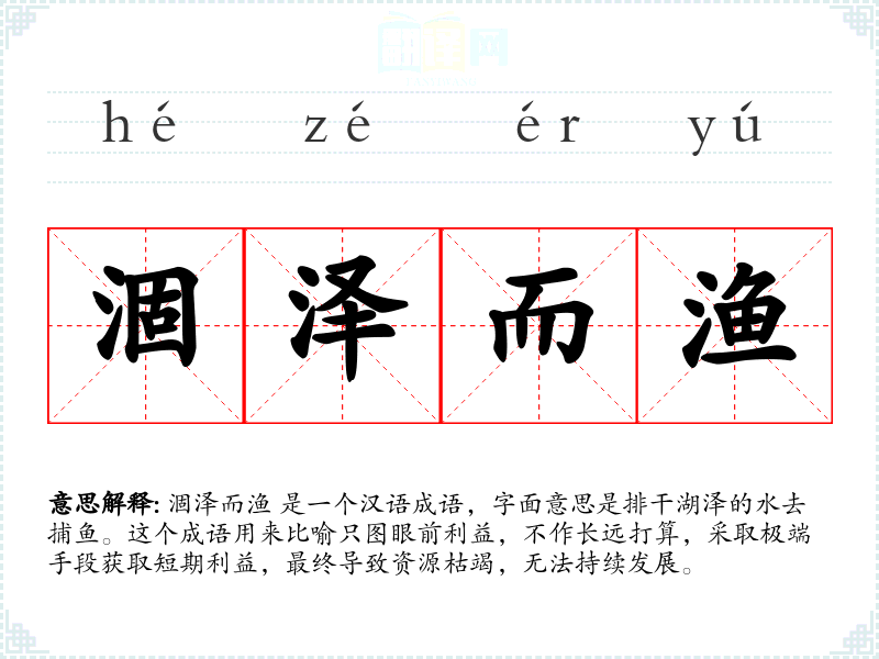 涸泽而渔 是一个汉语成语,字面意思是排干湖泽的水去捕鱼。这个成语用来比喻只图眼前利益,不作长远打算,采取极端手段获取短期利益,最终导致资源枯竭,无法持续发展。