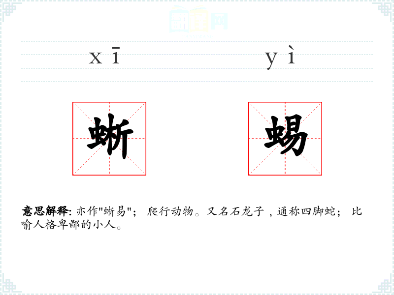 亦作"蜥易"; 爬行动物。又名石龙子﹐通称四脚蛇; 比喻人格卑鄙的小人。