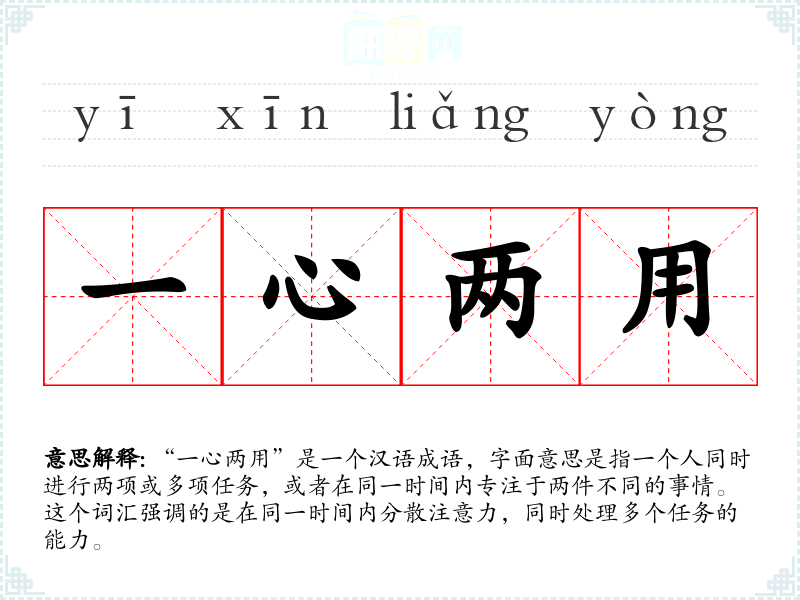 “一心两用”是一个汉语成语,字面意思是指一个人同时进行两项或多项任务,或者在同一时间内专注于两件不同的事情。这个词汇强调的是在同一时间内分散注意力,同时处理多个任务的能力。