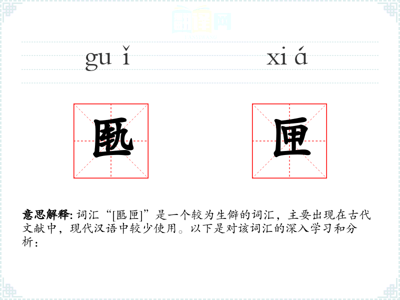 词汇“[匦匣]”是一个较为生僻的词汇,主要出现在古代文献中,现代汉语中较少使用。以下是对该词汇的深入学习和分析: