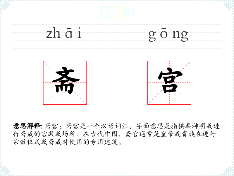 文学语境:在古代文学作品中,斋宫常被描绘为庄严、神圣的地方,如《红楼梦》中描述的贾府的斋宫,用于家族成员进行斋戒和祭祀。 口语语境:在现代口语中,斋宫一词较少使用,更多出现在历史或相关的讨论中。 专业领域:在历史学、建筑学和学等领域,斋宫是一个重要的研究对象,用于探讨古代**建筑的特点和功能。