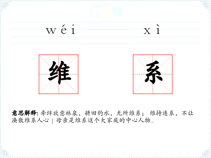牵绊放意林泉,耕田钓水,无所维系; 维持连系,不让涣散维系人心|母亲是维系这个大家庭的中心人物。