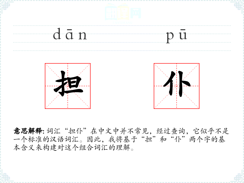 词汇“担仆”在中文中并不常见,经过查询,它似乎不是一个标准的汉语词汇。因此,我将基于“担”和“仆”两个字的基本含义来构建对这个组合词汇的理解。