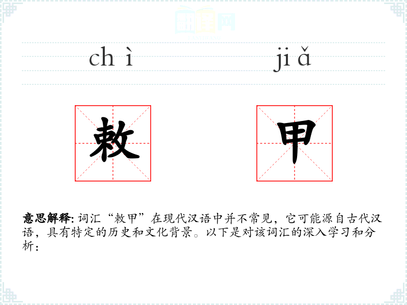 词汇“敕甲”在现代汉语中并不常见,它可能源自古代汉语,具有特定的历史和文化背景。以下是对该词汇的深入学*和分析: