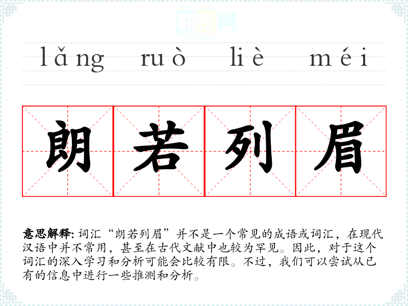 “朗若列眉”这个词汇的字面意思并不明确,但从字面上看,“朗”通常指明亮、清晰,“若”可以表示“如同”或“似乎”,“列眉”则不太常见,可能指的是眉毛排列整齐的样子。结合起来,这个词汇可能形容某物清晰可见,如同眉毛排列一样整齐。