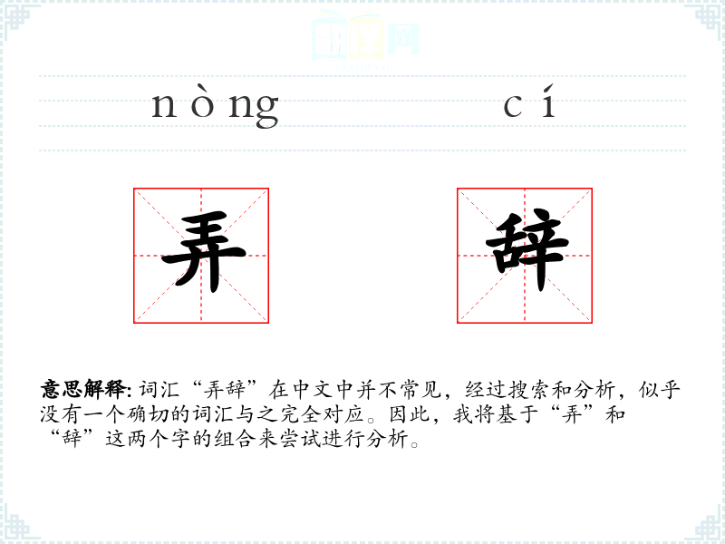 “弄”字在中文中有玩弄、摆弄、处理等含义,而“辞”字则有言辞、辞别、辞职等含义。将两者结合,“弄辞”可能指的是对言辞的玩弄或处理,即在言语上进行技巧性的操作或修饰。
