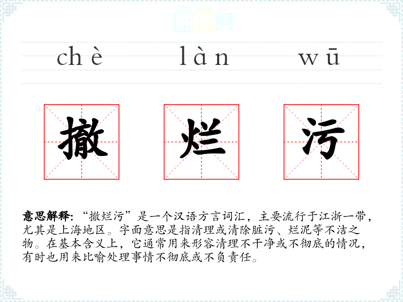 “撤烂污”是一个汉语方言词汇,主要流行于江浙一带,尤其是上海地区。字面意思是指清理或清除脏污、烂泥等不洁之物。在基本含义上,它通常用来形容清理不干净或不彻底的情况,有时也用来比喻处理事情不彻底或不负责任。