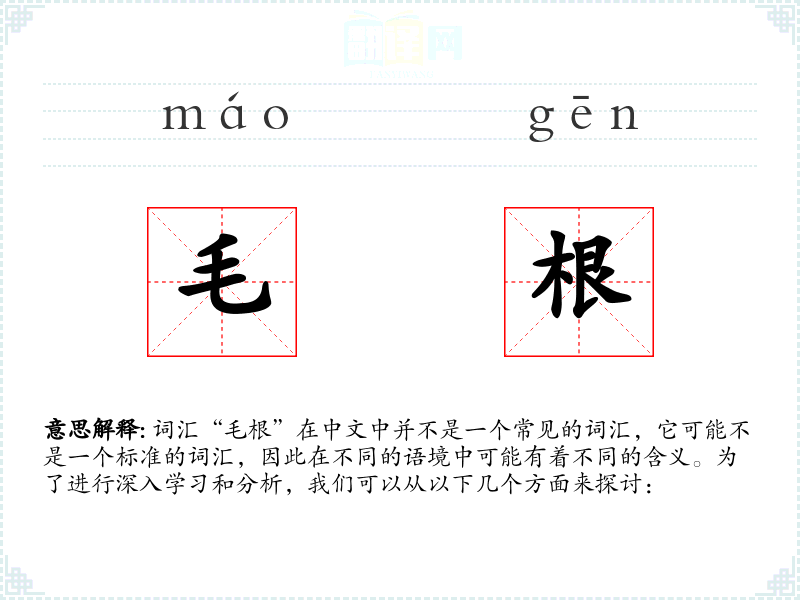词汇“毛根”在中文中并不是一个常见的词汇,它可能不是一个标准的词汇,因此在不同的语境中可能有着不同的含义。为了进行深入学习和分析,我们可以从以下几个方面来探讨: