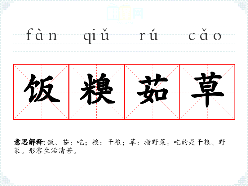 饭、茹:吃;糗:干粮;草:指野菜。吃的是干粮、野菜。形容生活清苦。