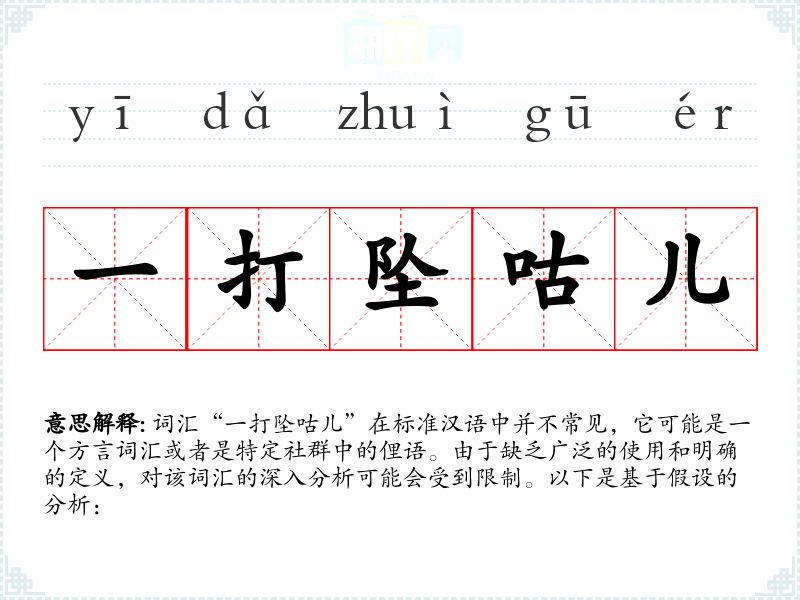 词汇“一打坠咕儿”在标准汉语中并不常见,它可能是一个方言词汇或者是特定社群中的俚语。由于缺乏广泛的使用和明确的定义,对该词汇的深入分析可能会受到限制。以下是基于假设的分析: