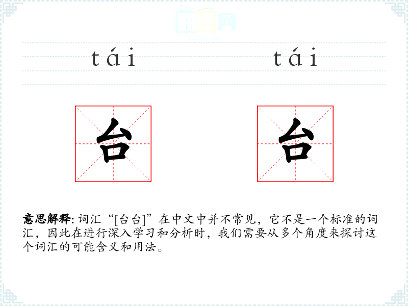 由于“[台台]”不是一个标准词汇,它的字面意思和基本含义不明确。在某些方言或特定语境中,它可能指代某种特定的物体或概念,但在普通话中,它没有明确的定义。