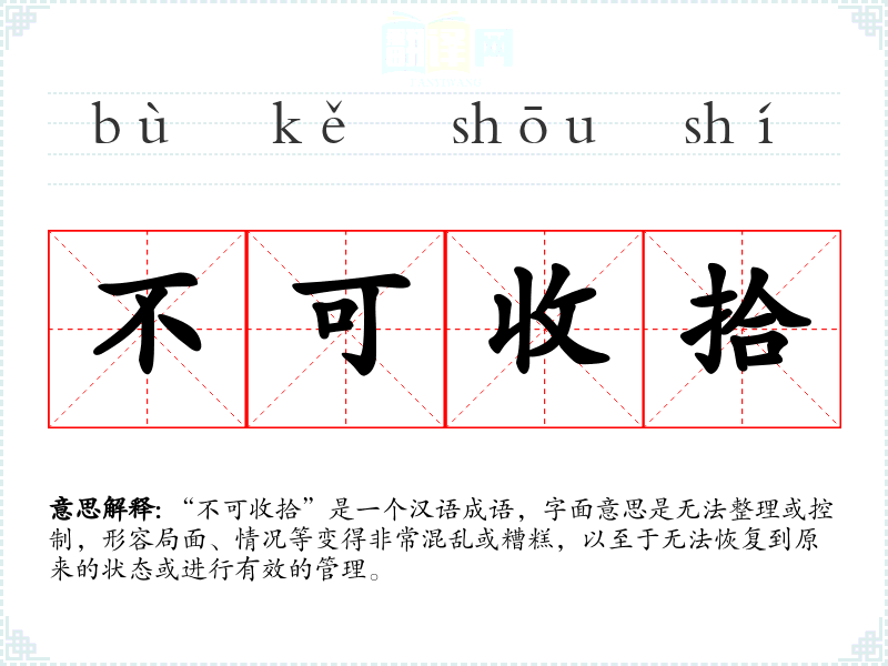 “不可收拾”是一个汉语成语,字面意思是无法整理或控制,形容局面、情况等变得非常混乱或糟糕,以至于无法恢复到原来的状态或进行有效的管理。