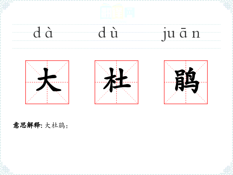 - 字面意思:大杜鹃是一种鸟类,属于杜鹃科,学名为Cuculus canorus。它是一种候鸟,常见于欧亚大陆的森林中。