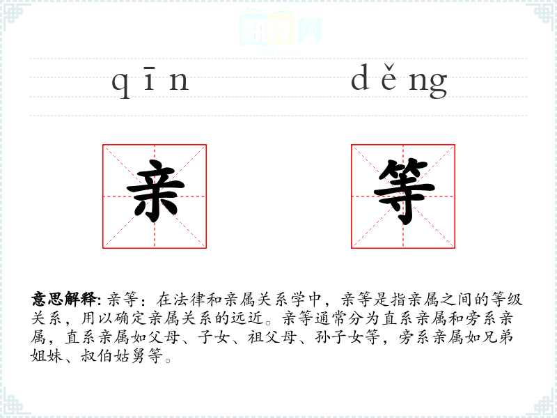 亲等:在法律和亲属关系学中,亲等是指亲属之间的等级关系,用以确定亲属关系的远近。亲等通常分为直系亲属和旁系亲属,直系亲属如父母、子女、祖父母、孙子女等,旁系亲属如兄弟姐妹、叔伯姑舅等。