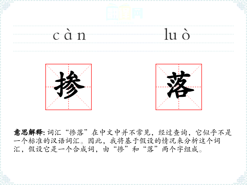 词汇“掺落”在中文中并不常见,经过查询,它似乎不是一个标准的汉语词汇。因此,我将基于假设的情况来分析这个词汇,假设它是一个合成词,由“掺”和“落”两个字组成。