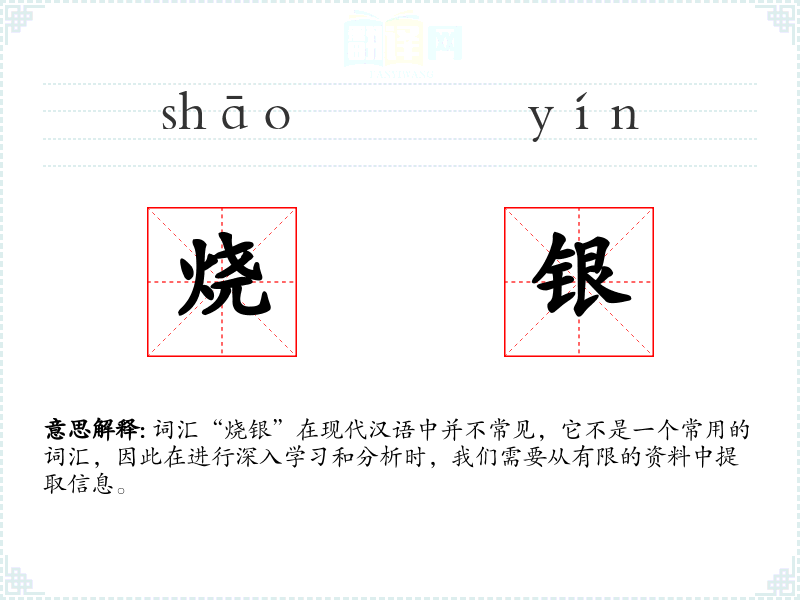 词汇“烧银”在现代汉语中并不常见,它不是一个常用的词汇,因此在进行深入学*和分析时,我们需要从有限的资料中提取信息。