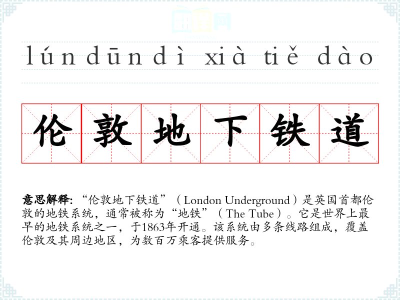 - "I take the London Underground every day to get to work."(我每天乘坐伦敦地铁去上班。)