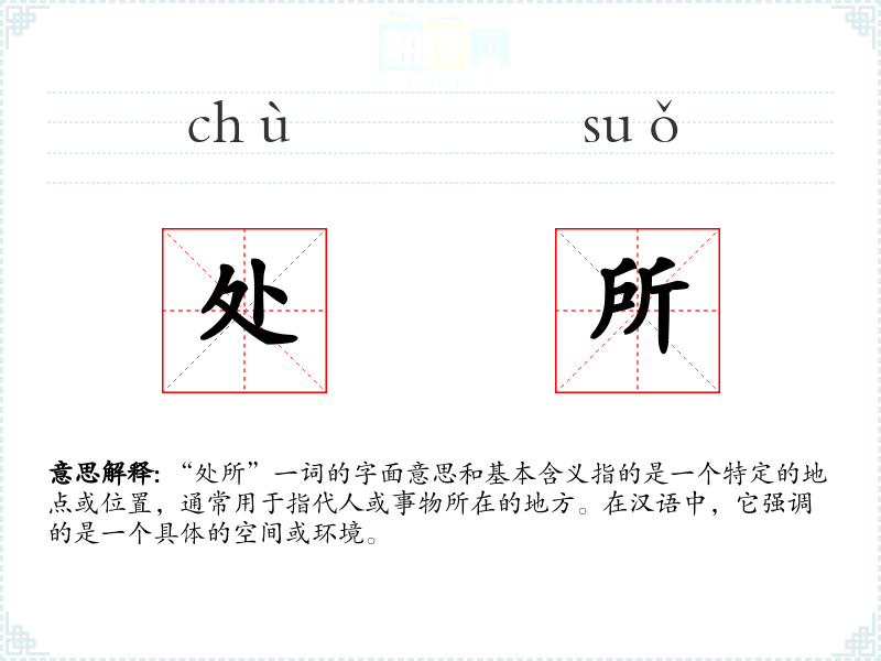 - 反义词:无(因为“处所”是一个中性词,没有直接的反义词)