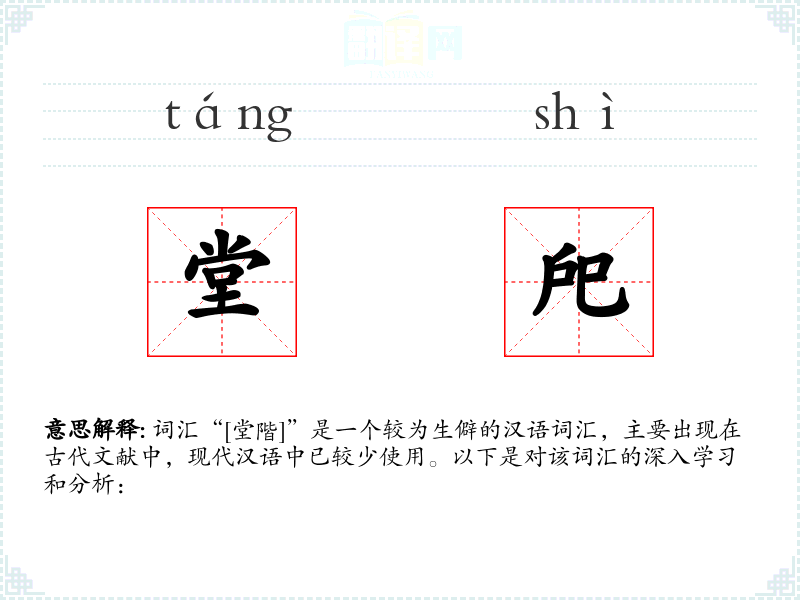 词汇“[堂階]”是一个较为生僻的汉语词汇,主要出现在古代文献中,现代汉语中已较少使用。以下是对该词汇的深入学*和分析:
