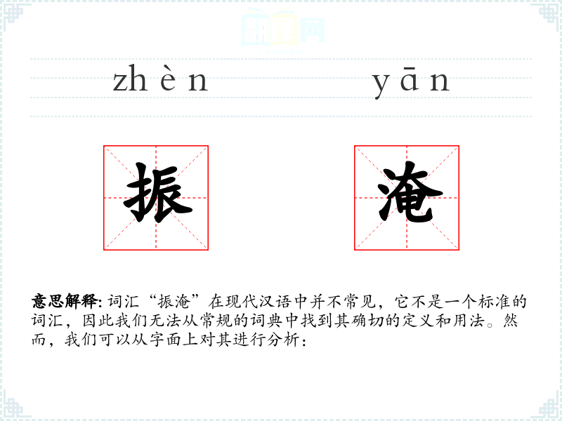 词汇“振淹”在现代汉语中并不常见,它不是一个标准的词汇,因此我们无法从常规的词典中找到其确切的定义和用法。然而,我们可以从字面上对其进行分析: