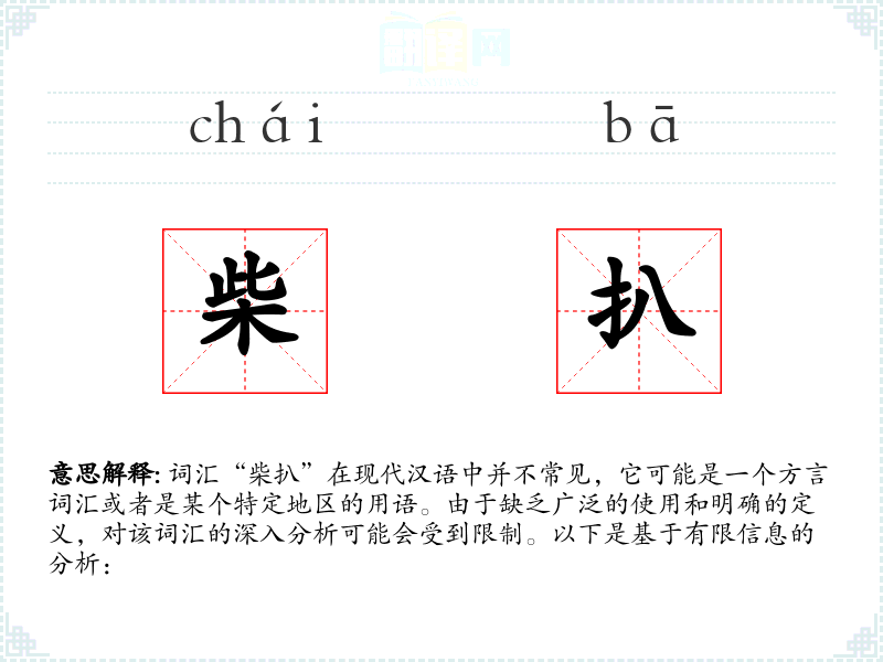 词汇“柴扒”在现代汉语中并不常见,它可能是一个方言词汇或者是某个特定地区的用语。由于缺乏广泛的使用和明确的定义,对该词汇的深入分析可能会受到限制。以下是基于有限信息的分析: