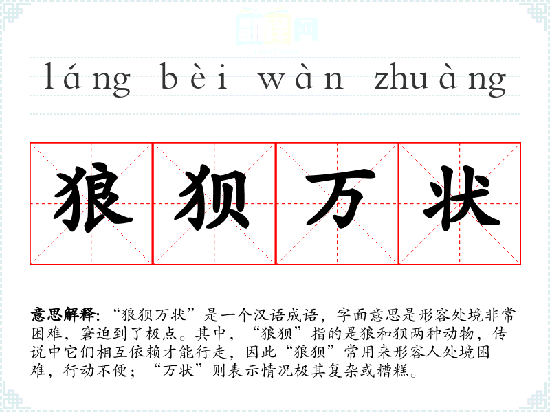 “狼狈”一词最早见于《左传·宣公十五年》,原指狼和狈两种动物相互依赖的特性。后来,这个词逐渐演变为形容人的困境。而“万状”则是用来加强语气的修饰词,表示情况极其复杂或糟糕。