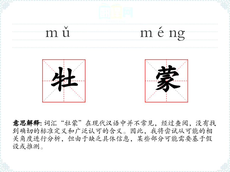 词汇“牡蒙”在现代汉语中并不常见,经过查阅,没有找到确切的标准定义和广泛认可的含义。因此,我将尝试从可能的相关角度进行分析,但由于缺乏具体信息,某些部分可能需要基于假设或推测。