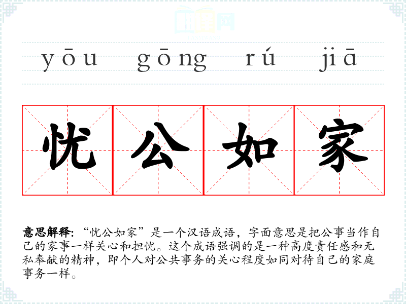 “忧公如家”是一个汉语成语,字面意思是把公事当作自己的家事一样关心和担忧。这个成语强调的是一种高度责任感和无私奉献的精神,即个人对公共事务的关心程度如同对待自己的家庭事务一样。