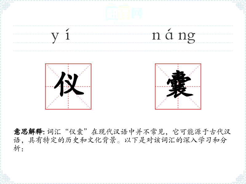 词汇“仪囊”在现代汉语中并不常见,它可能源于古代汉语,具有特定的历史和文化背景。以下是对该词汇的深入学*和分析: