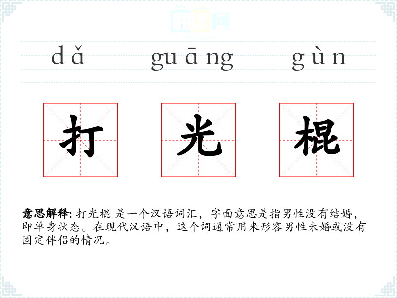 打光棍 是一个汉语词汇,字面意思是指男性没有结婚,即单身状态。在现代汉语中,这个词通常用来形容男性未婚或没有固定伴侣的情况。