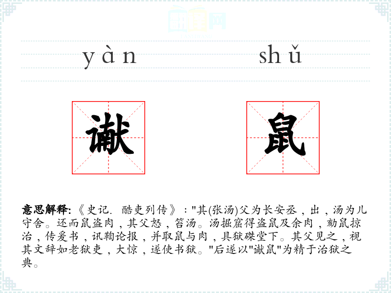 1.《史记.酷吏列传》﹕"其(张汤)父为长安丞﹐出﹐汤为儿守舍。还而鼠盗肉﹐其父怒﹐笞汤。汤掘窟得盗鼠及余肉﹐劾鼠掠治﹐传爰书﹐讯鞫论报﹐并取鼠与肉﹐具狱磔堂下。其父见之﹐视其文辞如老狱吏﹐大惊﹐遂使书狱。"后遂以"谳鼠"为精于治狱之典。