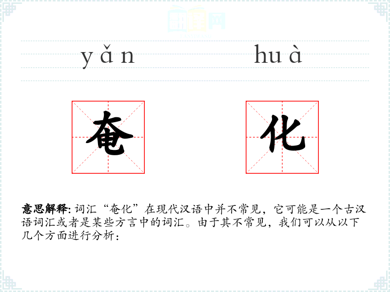 词汇“奄化”在现代汉语中并不常见,它可能是一个古汉语词汇或者是某些方言中的词汇。由于其不常见,我们可以从以下几个方面进行分析: